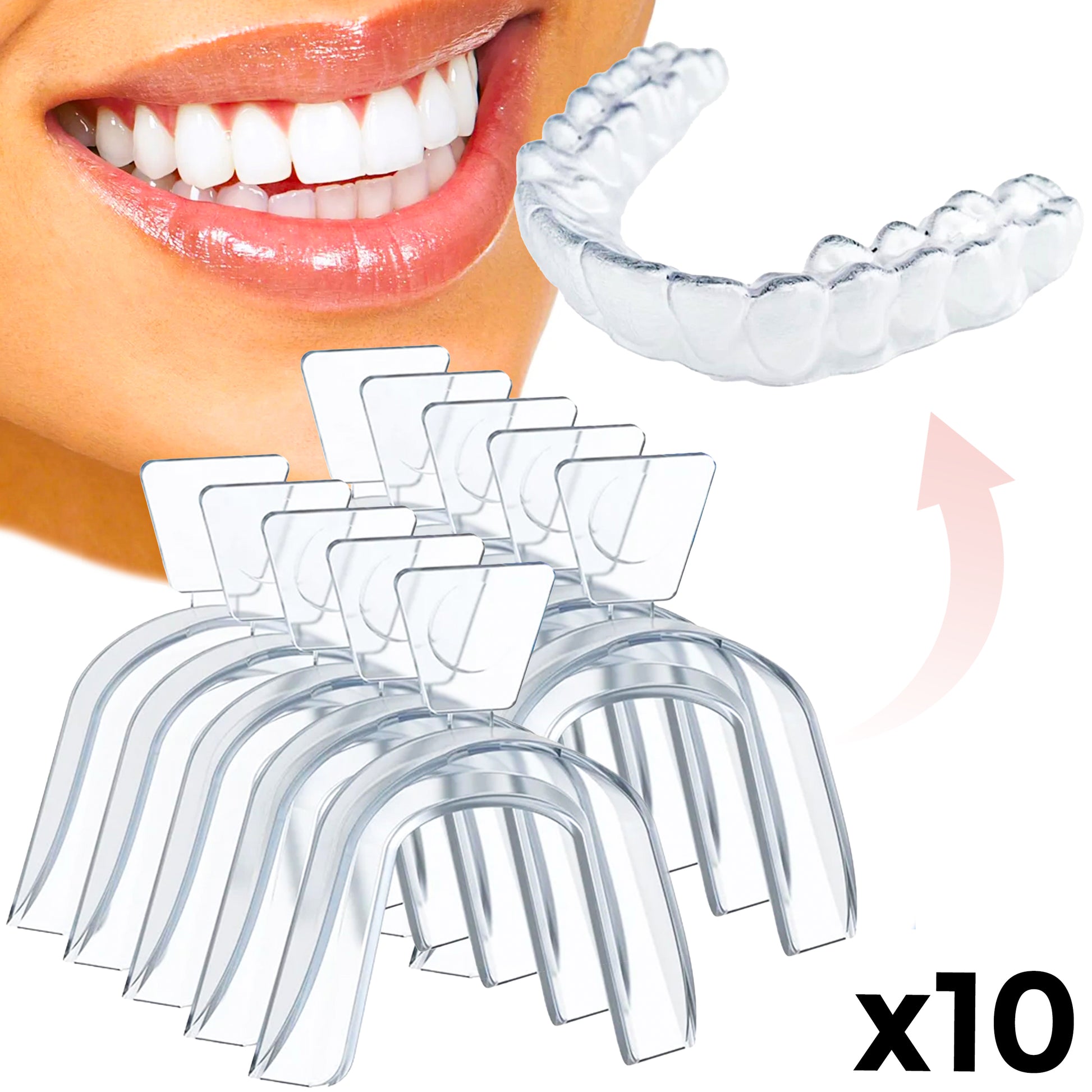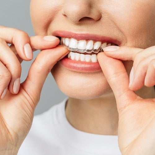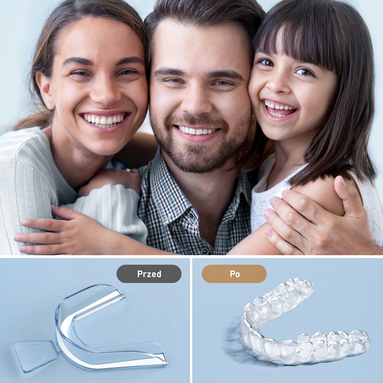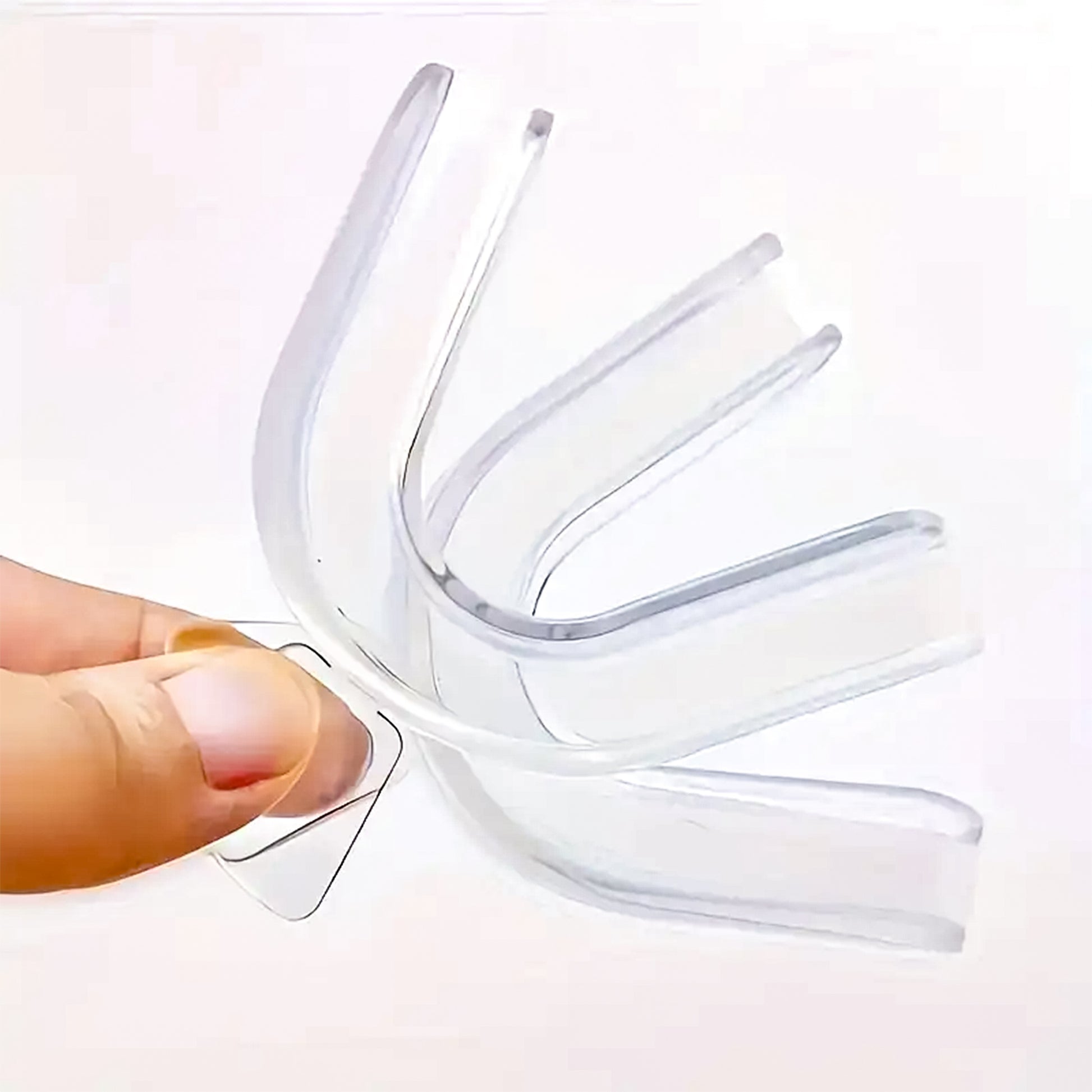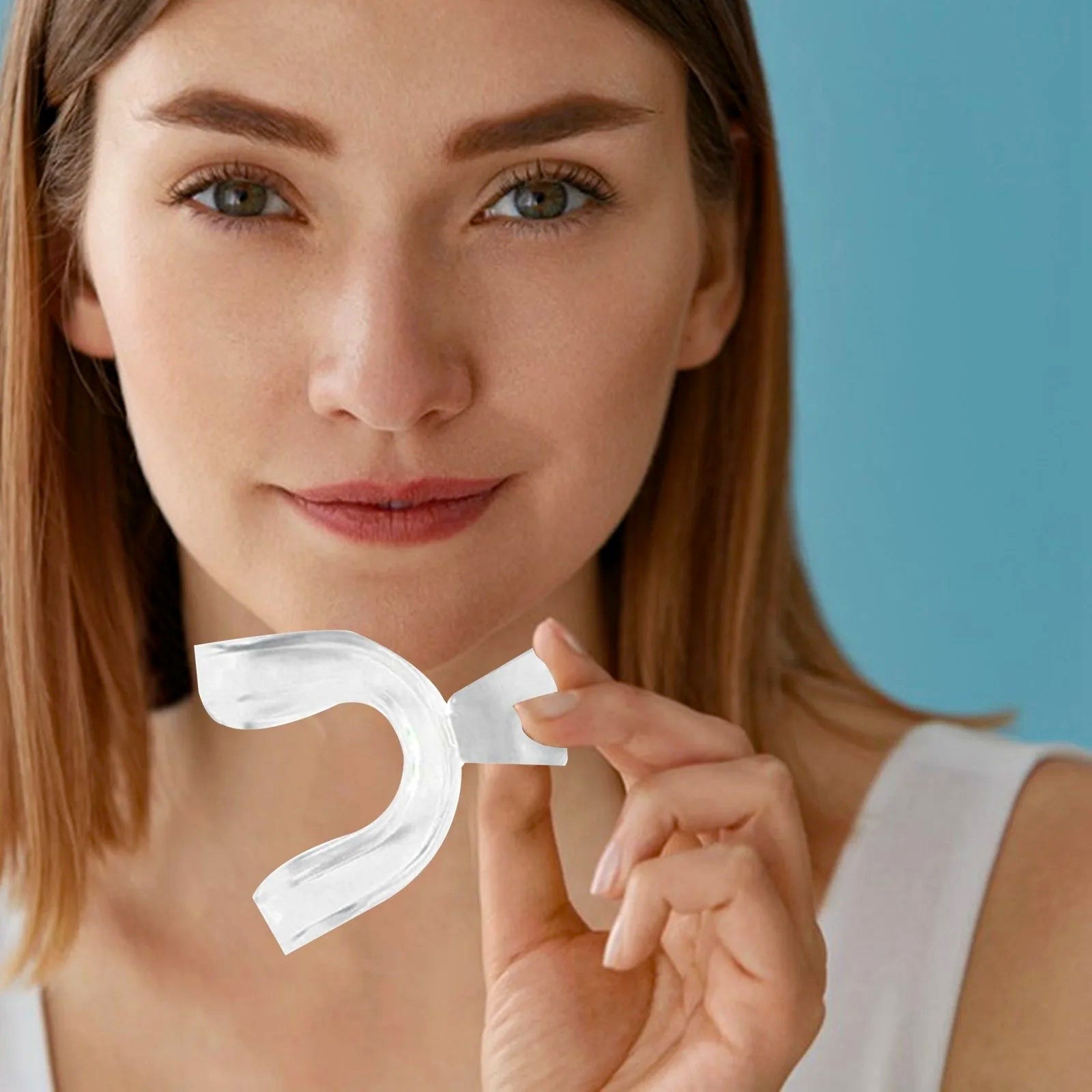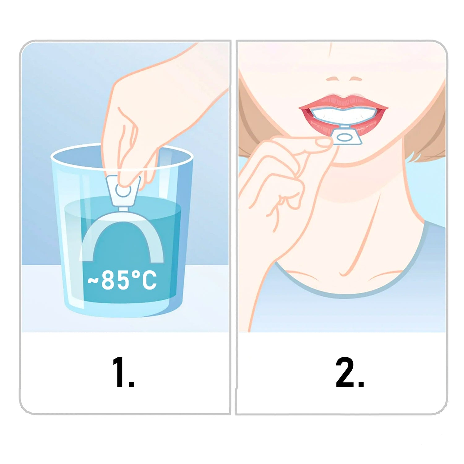 ✅ Krok 2: Nałóż szynę na górną lub dolną partię zębów, zaciśnij je i zassij, by materiał precyzyjnie dopasował się do Twojego łuku zębowego. Przytrzymaj szynę w tej pozycji przez 10 sekund.